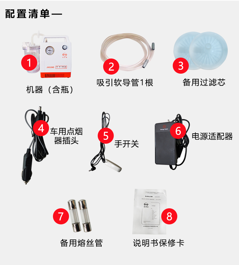 上海斯曼峰 便携式吸引器 JX820D(铅酸电池)产品附件:
