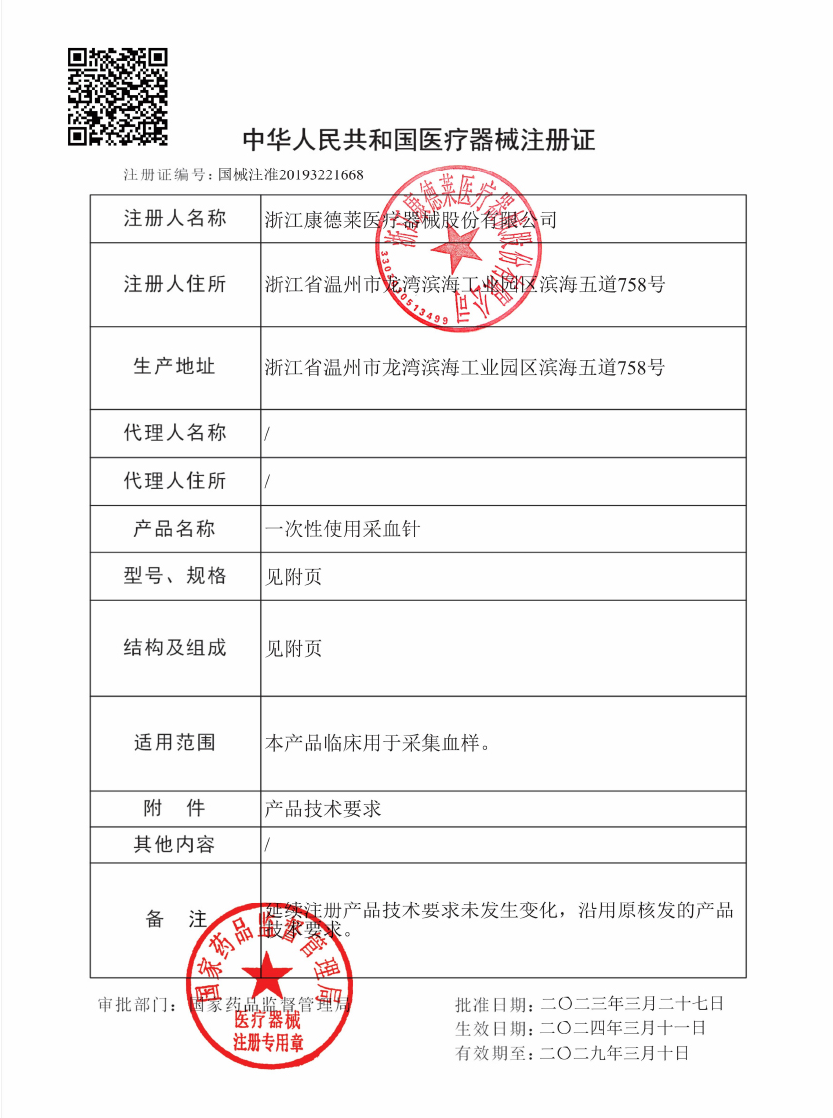 康德莱 一次性使用采血针 7# 产品特点: