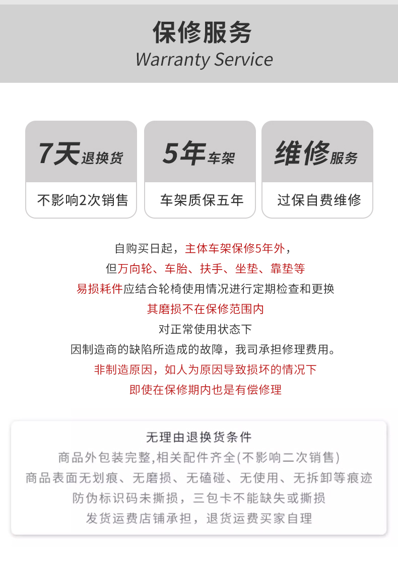 关于保修:自购买日起,除了本体车架保修5年外,其他部分保修1年。对正常使用状态下,因制造商的缺陷所造成的故障,我司承担修理费用。但万向轮、车胎、扶手、坐垫、靠垫等易损耗件应结合轮椅使用情况进行定期检查和更换,其磨损不在保修范围内。(非制造原因,如人为原因导致损坏的情况下,即使在保修期内也是有偿修理)